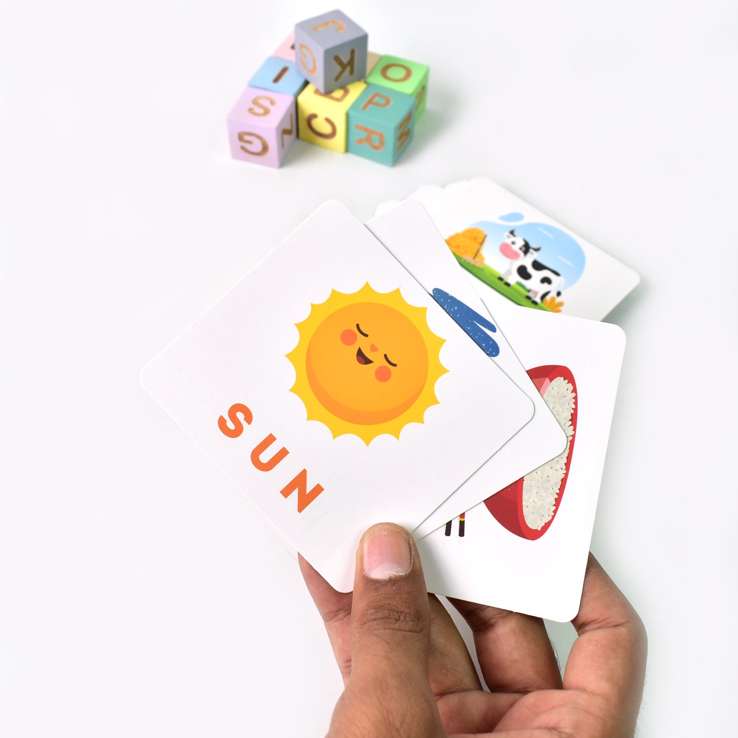 - 【Spelling & Reading Educational Toys】- The kids can recognize objects based on each flash cards picture, or spell out corresponding words with letter cubes. Color pictures increase kids interest in learning and use cubes to spell words flexibly to improve children's memory.Great kindergarten learning games for kids 5-7.