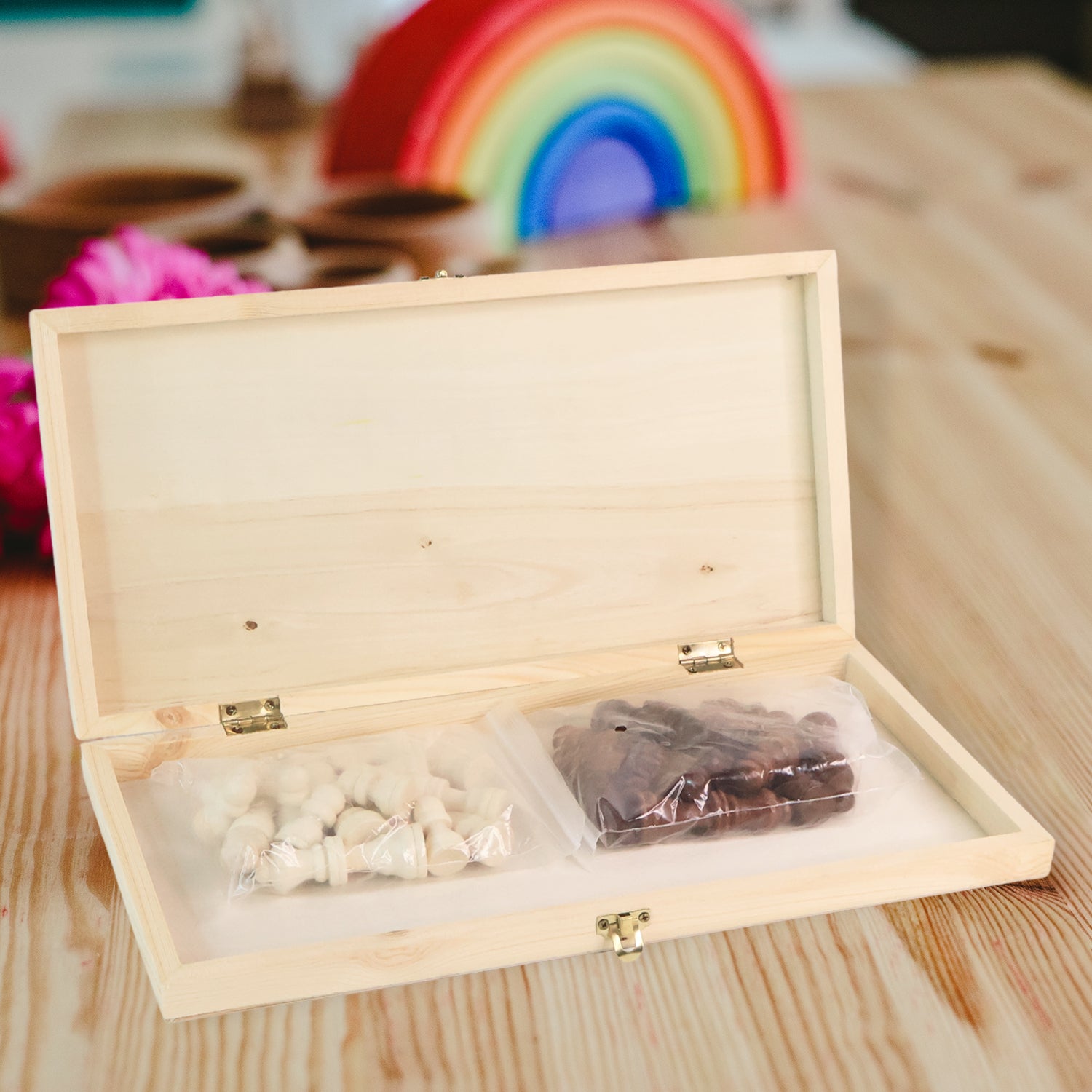 - Material: Wooden Board and Brown/Yellow Polished Wood Chessmen.